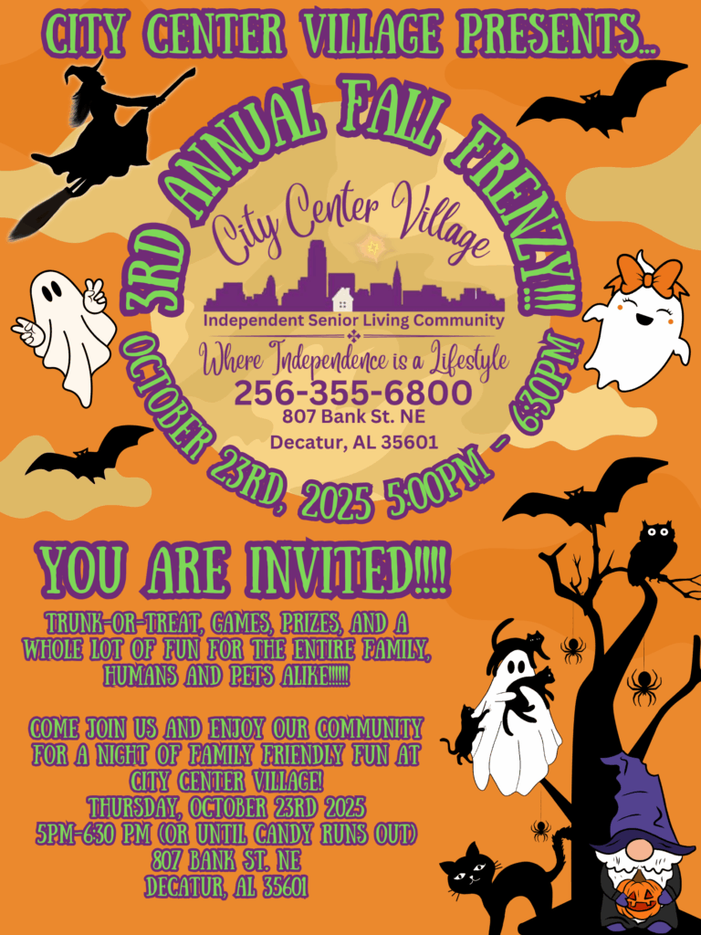 Trunk or Treat, Games, Prizes and a Whole Lot of Fun for the ENTIRE FAMILY!!!!! Come join us and enjoy our community for a night of Fall Frenzy Fun! From 5pm till 6:30pm (or until candy runs out!)